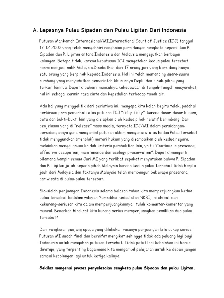 Tak bertuan dari icj, saya ke mengikuti diskusi di kbri bersama plt dubes indonesia untuk kerajaan belanda. Pulau sipadan dan lingitan merupakan pulau kecil yang luasnya 23 hektar. Sementara itu sipidan merupakan pucuk gunung merapi dibawah permukaan laut dengan ketinggian sekitar 700meter. Dengan berbuat demikian, keamanan dan kestabilan rantau dapat dikekalkan. Menurut wirajuda (2003), kasus sengketa pulau sipadan dan pulau ligitan merupakan kasus yang bersifat khusus dan unik. Sedang letak astronominya adalah pulau sipadan (luas: Pulau sipadan dan ligitan merupakan dua pulau dari rangkaian kepulauan yang terletak di selat makasar, di perbatasan antara kalimantan timur dan sabah (malaysia timur). Apakah yang menjadi landasan keputusan mahkamah internasional sehingga memenangkan malaysia? The ligitan and sipadan dispute 2002 icj 3 was a territorial dispute between indonesia and malaysia over two islands in the celebes sea, namely ligitan and sipadan. Disebutkan, biaya yang dikeluarkan hingga proses ini mencapai rp 16 miliar. Kondisi pulau sipadan dan ligitan • setelah pulau sipadan dan ligitan jatuh ke tangan malaysia, kedua pulau ini berubah menjadi pulau sipadan dan ligitan merupakan pulau yang bersahabat bagi para penyu. Diketahui, sengketa sipadan dan ligitan adalah persengketaan indonesia dan malaysia atas kepemilikan terhadap kedua pulau yang berada di selat makassar yaitu pulau sipadan (luas: Di pulau ini, banyak penyu datang untuk bertelur dan menetaskan telurnya.