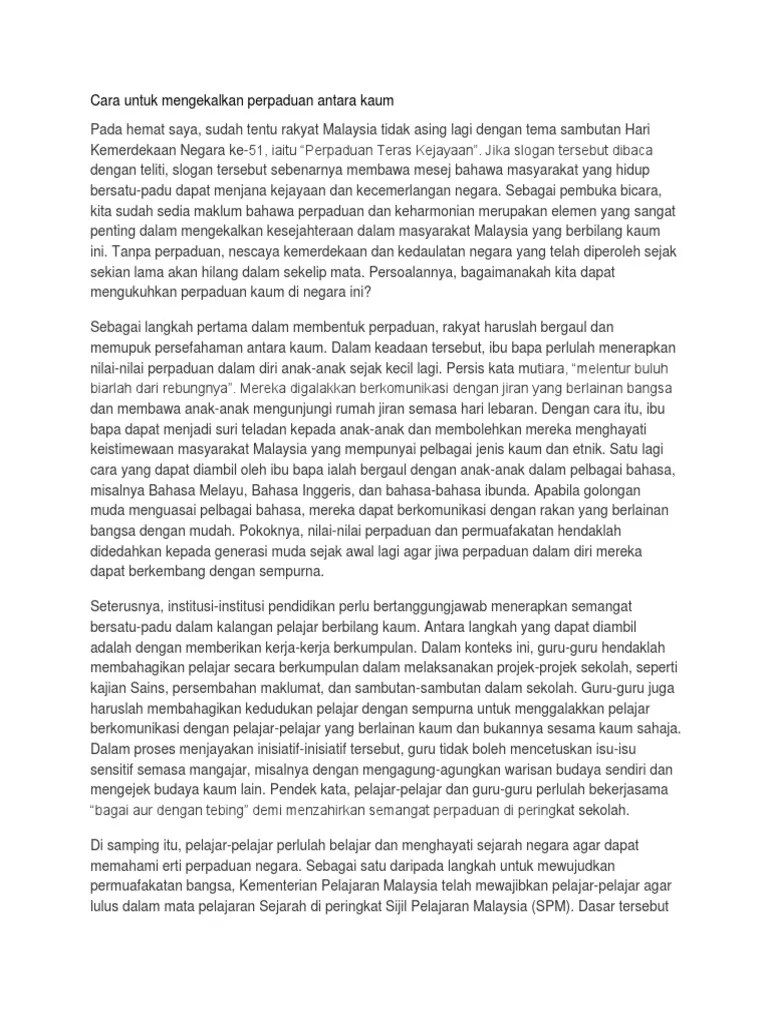 Karangan Cara Cara Memupuk Semangat Perpaduan Dalam Kalangan Pelajar from demo.dokumen.tips Kita haruslah bertolak ansur, sabar, dan mengawal diri demi mengelakkan pertelingkahan dan perselisihan faham untuk kesejahteraan hidup malaysia. Feb 23, 2015 · bagi memantapkan lagi perpaduan dikalngan rakyat pelbagai etnik dan kaum, kerajaan telah menubuhkan kementerian negara dan pembangunan masyarakat pada 27 oktober 1990 dengan tujuan untuk mwnggalakkan perpaduan masyarakat pelbagai kaumda integrasi, memberi bantuan khidmat kebajikan masyarakat, membangunkan dan mengintegrasikan masyarakat kaum asli, memajukan kepentingan dan penglibatan wanita. Sep 24, 2014 · kejayaan negara malaysia mengekalkan perpaduan masyarakat yang berbilang kaum sejak merdeka hingga kini amat mengagumkan. Proses ini dilakkukan mulai 1948 hinggalah 1956. Dalam hal ini, perpaduan kaum amat penting untuk mengekalkan kestabilan politik. Perpaduan merupakan matlamat yang amat penting bagi semua negara yang merdeka. Keharmonian dalam kepelbagaian agama fitri dayana binti fatkhur rodzi (2018680468), nur rasyidah binti abdullah (2018680384), siti nabilla binti mohd yusoff (2018673882), muhammad faizzudin bin mohamad zan (2018262538) ctu 553 ethnic and relations bachelor in medical laboratory technology (hons), faculty of health sciences, universiti teknologi mara sila imbas kod qr tajuk video: Tambah pula, aspek perpaduan telah dianggap sebagai tulang belakang kepada kegemilangan malaysia.